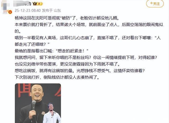 看到这一幕的老杨,当场就变了脸,事后就有观众反应老杨最后心态有点崩了,说了声人都走了还唱啥。 他这不说不要紧,一说中途又有几个人走了,而还留在台下的观众心里也不是个滋味。
