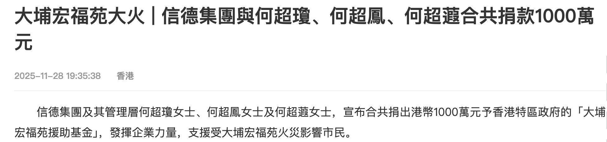 四房梁安琪秉持低调行善理念,通过慈善基金会捐赠 100 万港币,相关善举因受赠方保良局公开致谢才为外界知晓。其儿子何猷亨、何猷君各捐 100 万,何猷君更与妻子奚梦瑶以夫妻名义共同捐赠,传递公益初心。 三房方面,何超莲通过个人创办的 Smile With Us HK 基金会捐赠 100 万港币,专项用于受灾居民安置与生活补给。三太陈婉珍及其子何猷启均曾任职东华三院相关职务,向来热心公益,虽暂无公开捐赠信息,但结合其过往善举,大概率已通过私下方式助力救灾。