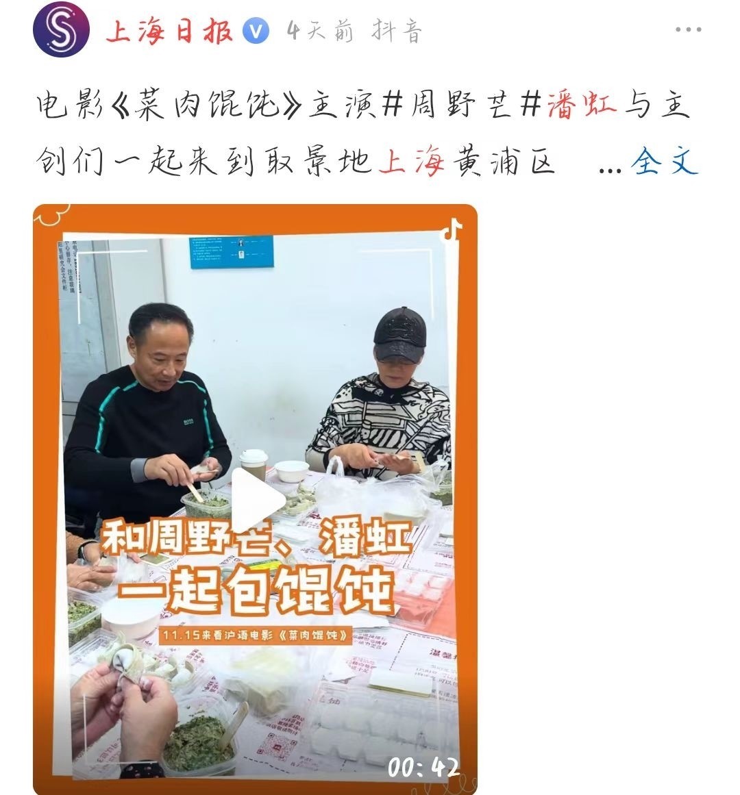 部分参考文献:电影《菜肉馄饨》主演#周野芒#潘虹与主创们一起来到取景地上海黄浦区的雁荡居民区,和嬢嬢们一起包馄饨。11月15日沪语电影《菜肉馄饨》将在上海、浙江、江苏率先上映。-上海日报