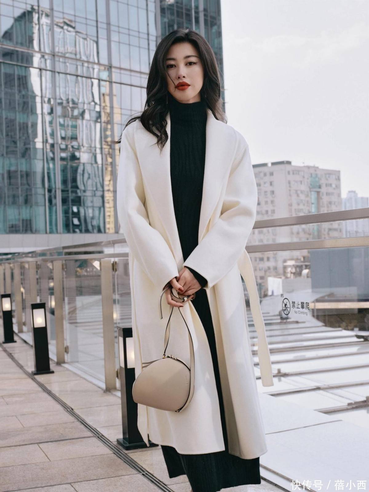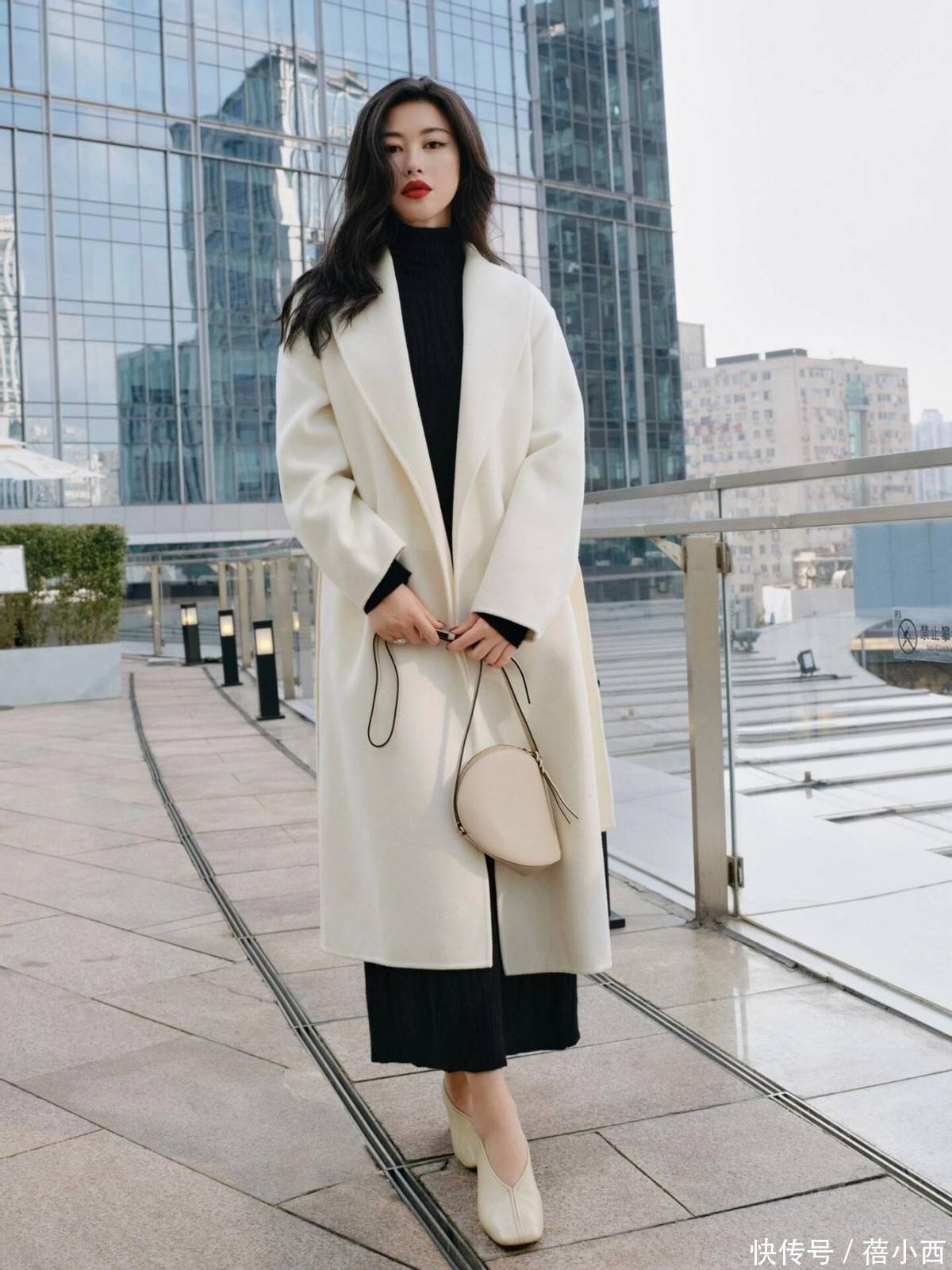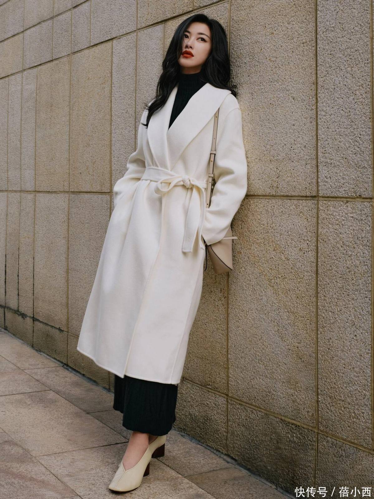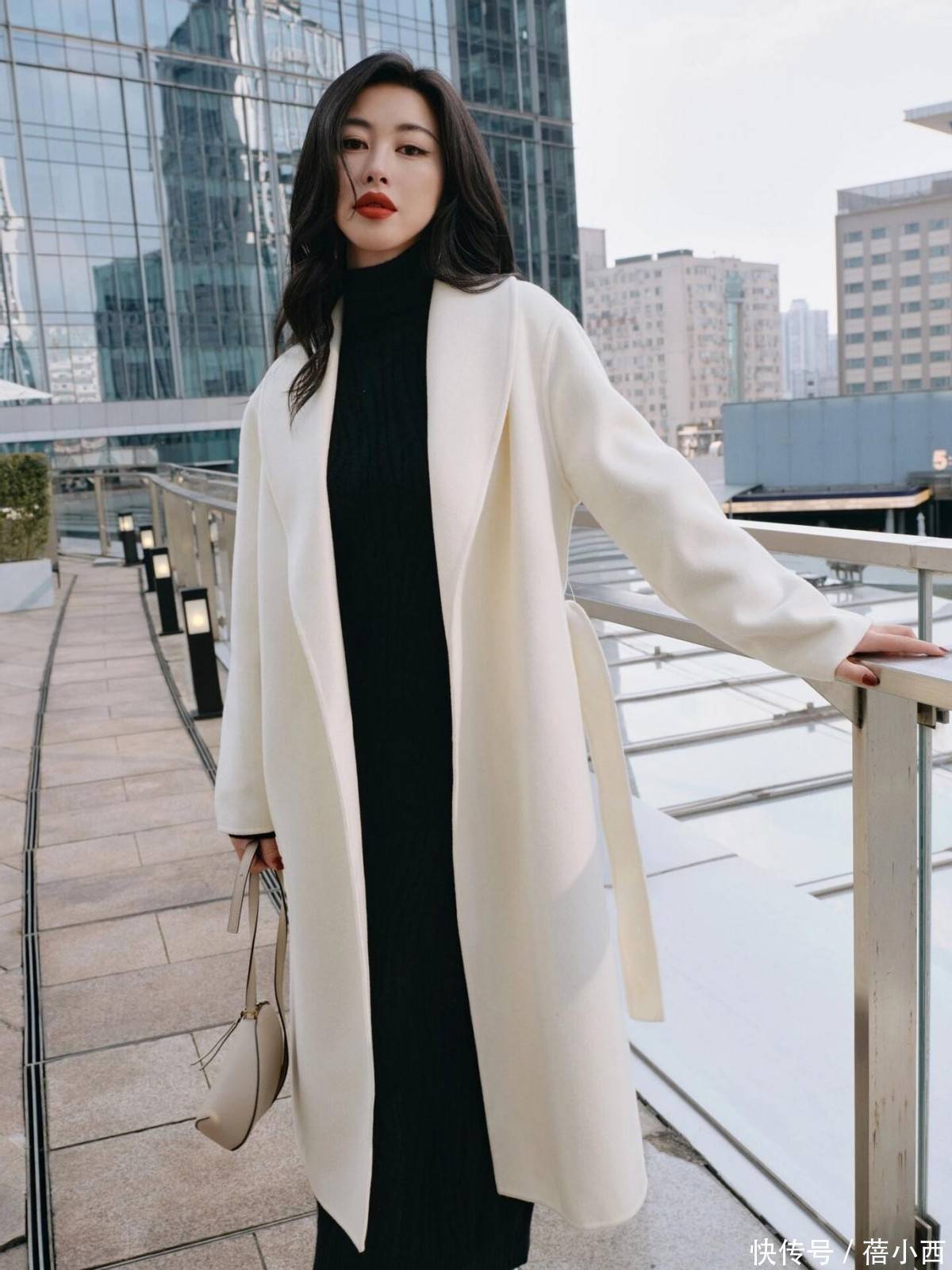 另一套白色大衣造型更显巧思,米白色大衣搭配黑色高领针织衫与同色系阔腿裤,只在包包处加入浅米色作为过渡,看起来非常温柔低调。而且白色大衣自带清冷高级感,黑色内搭强化了视觉重心,深浅对比让整体造型利落又不失温柔,这种 “三色原则” 并不单调,反而能让她通过控制色彩数量,让穿搭更有呼吸感,避免了色彩堆砌带来的廉价感。