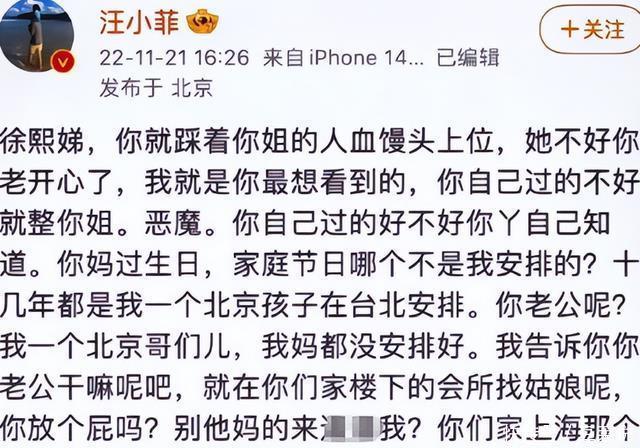 不知道您对此有什么看法呢?欢迎在下方评论区留下你的想法,喜欢文章记得点赞关注我们下期再见。 [免责声明]文章的时间、过程、图片均来自于网络,文章旨在传播正能量,均无低俗等不良引导,请观众勿对号入座,并上升到人身攻击等方面。观众理性看待本事件,切勿留下主观臆断的恶意评论,互联网不是法外之地。本文如若真实性存在争议、事件版权或图片侵权问题,请及时联系作者,我们将予以删除。 信息来源: 百度百科:徐熙媛、汪小菲、宣萱、王晶个人资料 具俊晔痛哭深吻告别大S,汪小菲双眼通红称与大S“永远是家人”.羊城晚报-今日头条.[2025-02-04]. 九派新闻.大S起诉张兰汪小菲,“持续实施侮辱、诽谤等行为”,张兰发律师函回应:立即停止炒作,一言一行皆有法.今日头条.[2023-08-09]. 大S春节猝逝!享年48岁 家属悲恸证实:流感并发肺炎.今日头条-ETtoday星光云.[2025-02-03].